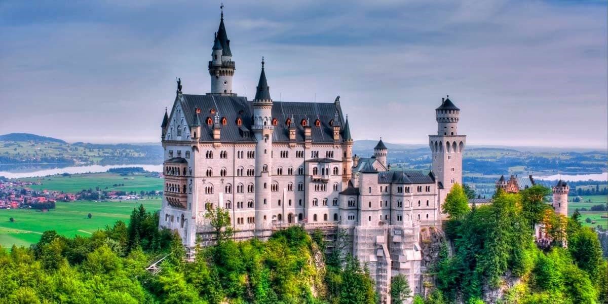 Замок Нойшванштайн – «Лебединий камінь» – це втілена фантазія, замок-казка, піднявши свої, ніби іграшкові, башточки і галереї над лісистими пагорбами в баварських Альпах під містом Фюссен, поблизу австрійського кордону. При цьому у замка досить значні розміри, та й будувався він протягом сімнадцяти років. Будуючи цей замок, король Баварії Людвіг II прагнув втілити в його архітектурі свої уявлення про романтику. Внутрішнє оздоблення замку являє собою суміш різних архітектурно-художніх стилів, поєднання мавританських, готичних і барокових елементів: колони-сталактити, тронний зал в декадентсько-візантійському дусі, і співочий зал з вишуканим освітленням, що призначався для постановок вагнерівських опер.