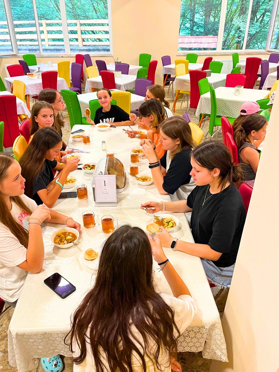 У нашому таборі 5-разове харчування: сніданок (за вибором дітей), другий сніданок, обід, підвечірок, вечеря, друга вечеря. Команда кухарів готує смачні, різноманітні та корисні страви. Екологічно чисті сертифіковані продукти, ніяких напівфабрикатів і заморожених продуктів. У раціоні – смачні перші страви, м’ясні та молочні продукти, фрукти та овочі. Обслуговування офіціантами. Вожаті під час харчування завжди знаходяться поруч з дітьми.